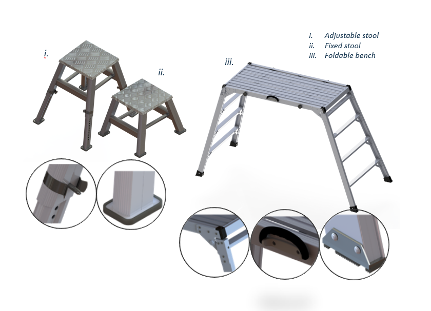 Apart from ladders, Wonder provides alternative lightweight, portable stools and foldable benches for professional as well as domestic use (especially).